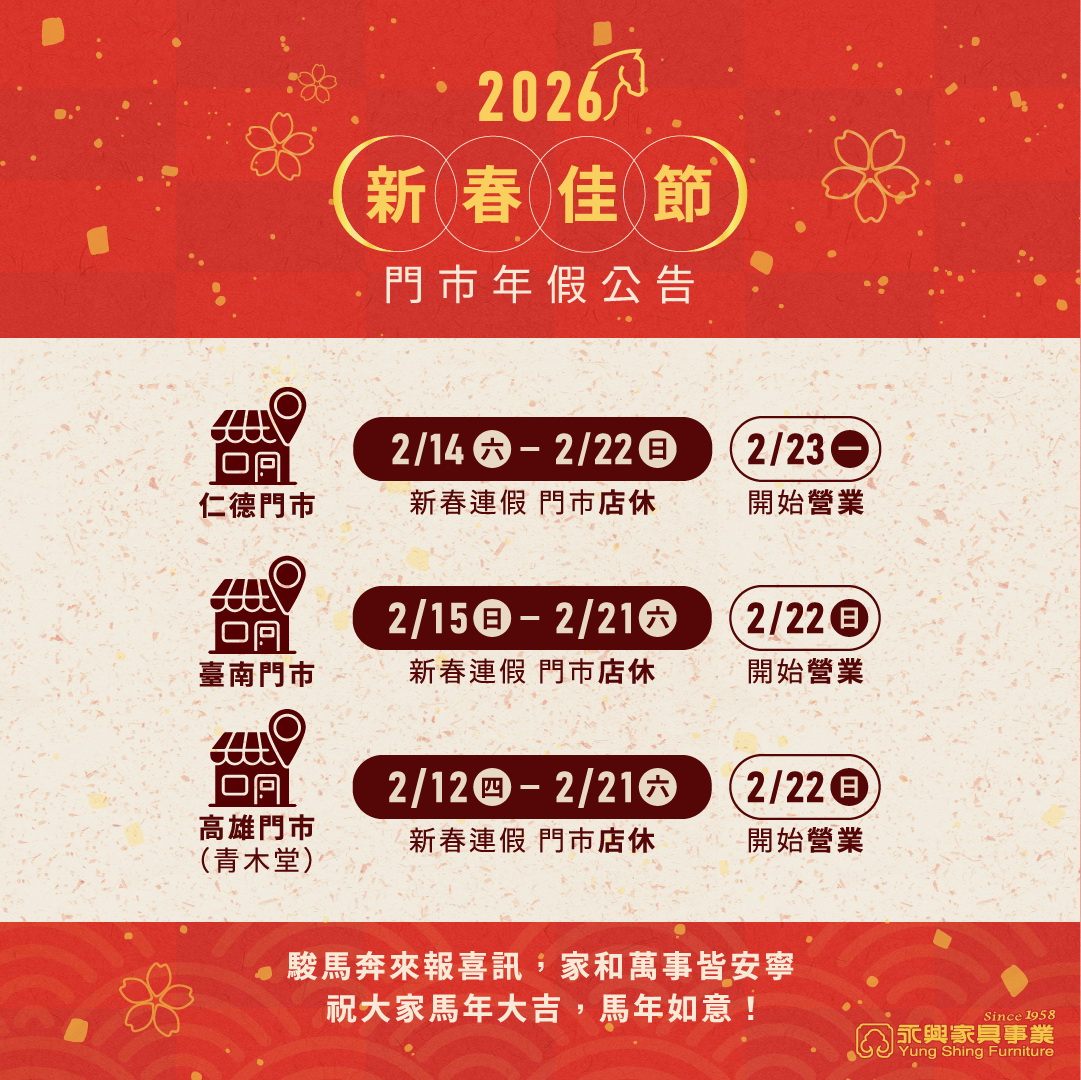 - 臺南門市:2/15–2/21 店休,2/22 開始營業。